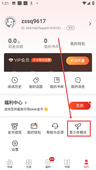 2、进入【我的】页面,点击【青少年模式】选项,可进入该模式的开启流程,需先设置独立密码来启用。