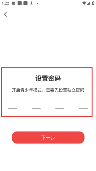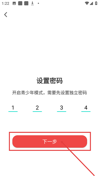 4、在【设置密码】页面,输入4位独立密码后,点击【下一步】按钮,可继续完成青少年模式的开启配置。