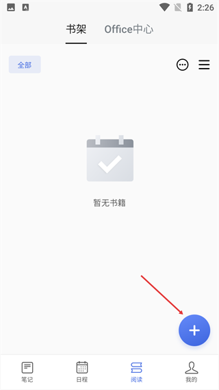 2、在书架页面,点击右下角的蓝色加号按钮,弹出“添加书籍”的操作选项弹窗。