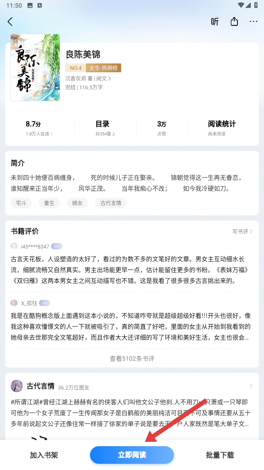 3、在小说详情页,点击【立即阅读】,即可进入阅读界面,开启沉浸式阅读之旅哦。