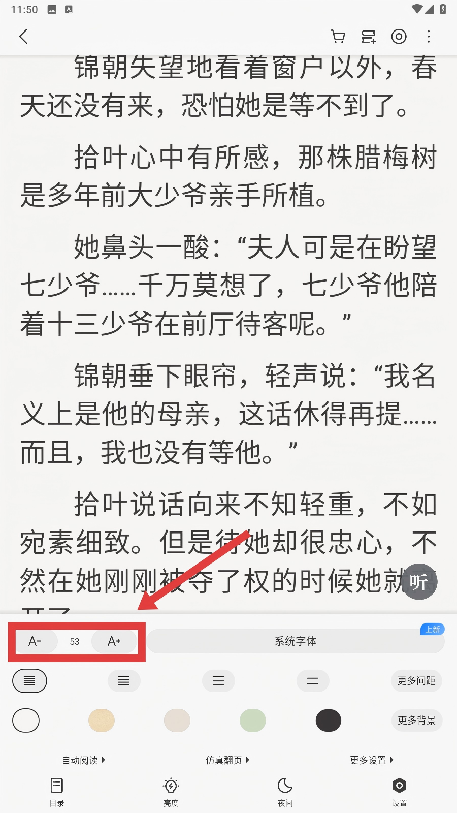 4、在阅读界面,点击屏幕呼出设置栏,通过【A-】、【A+】按钮,可自由调节字体大小,打造舒适的体验啦。