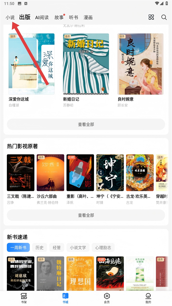 1、在掌阅中点击【小说】分类,进入小说专区,这里有各类小说资源,方便我们挑选喜欢的读物呢。