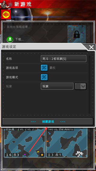 1、在游戏设置界面选择“死斗:2名玩家”模式,点击“创建游戏”进入关卡,核心玩法是建造防御设施、训练单位,击败敌方势力。