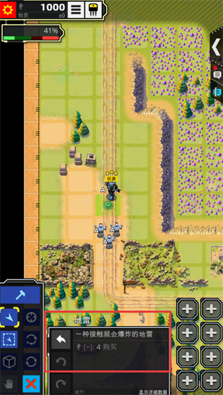 2、初始拥有1000资源,先建造地雷(消耗4资源),部署在道路等敌方单位必经区域,用于拦截敌方推进。