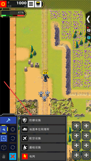 3、打开防御设施菜单,可选择地雷、火炮等防御建筑,或训练地面/航空单位,按需搭配防御体系与进攻兵力。