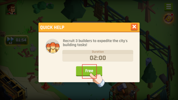 3、点击【Free】招募3个建筑工人,加快城市建设任务的推进速度。