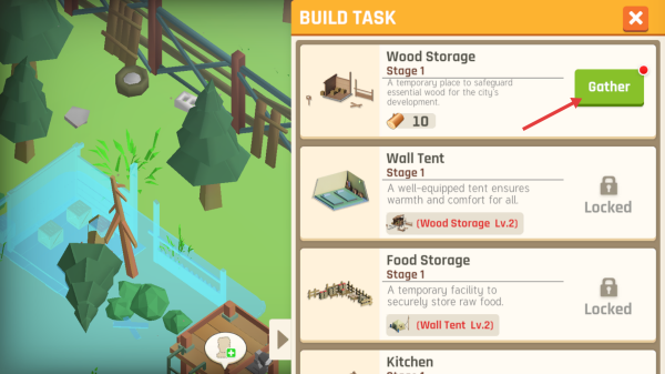 2、点击【Gather】收集木材,完成【Wood-Storage】的阶段1建设任务。