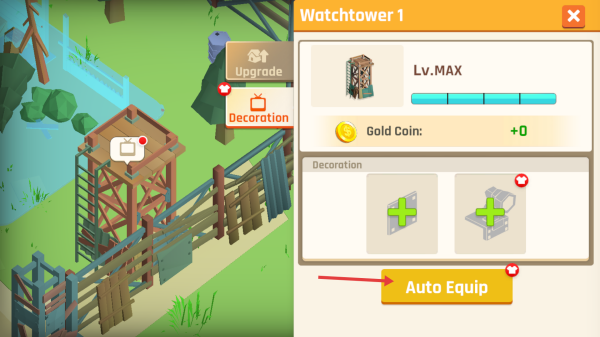 1、点击【Auto-Equip】自动装备瞭望塔装饰,完成该建筑的装饰配置。