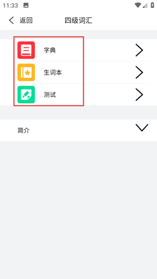 3、进入【四级词汇】页面后,可通过【字典】【生词本】【测试】功能学习单词。