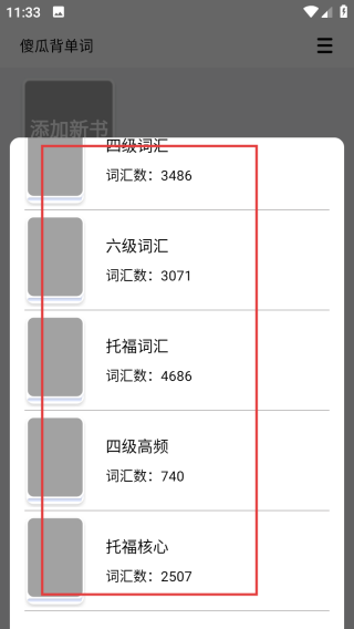 1、点击【傻瓜背单词】首页的【添加新书】按钮,进入词汇书选择界面。