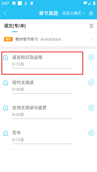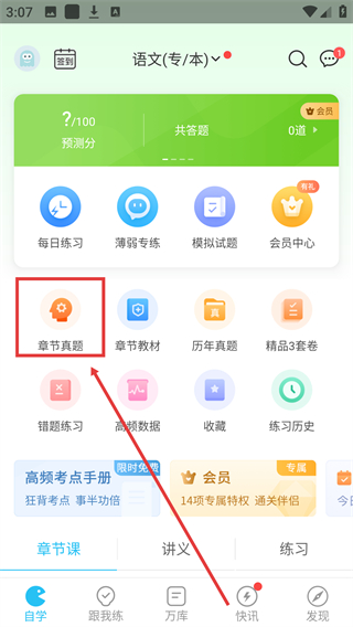 1、进入【语文(专/本)】页面,找到【章节真题】按钮,点击进入对应章节的真题练习界面。
