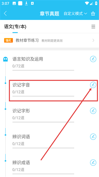 3、在展开的内容中,选择【识记字音】选项,点击进入该知识点的练习配置页面。