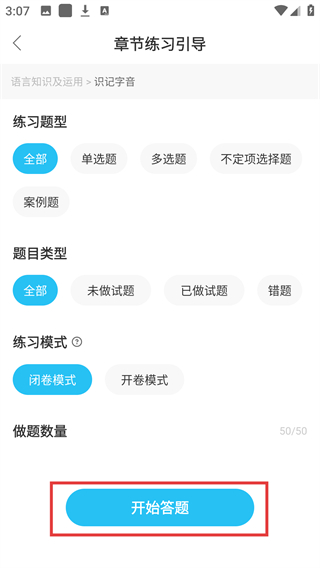 4、进入【章节练习引导】页,确认题型、模式等设置后,点击【开始答题】按钮启动练习。