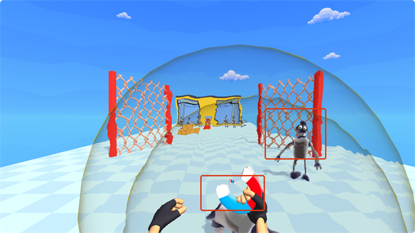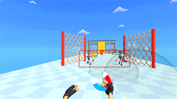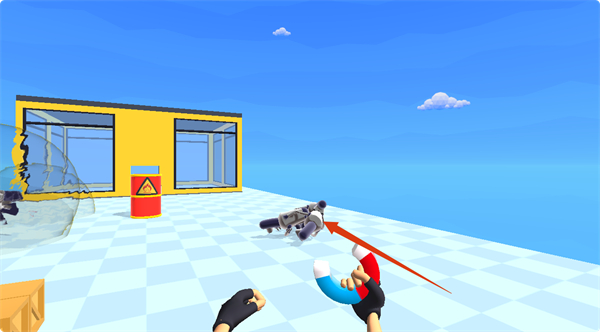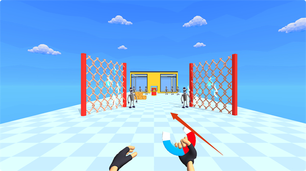 1、进入场景后,利用手中磁铁道具,瞄准前方机器人敌人,准备发动攻击,注意观察敌人分布与场景布局。