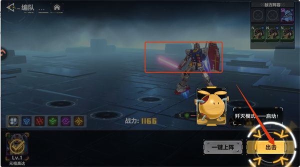 3、在编队界面,确认机甲阵容后,点击【出击】按钮,进入战斗场景,开始挑战敌人。
