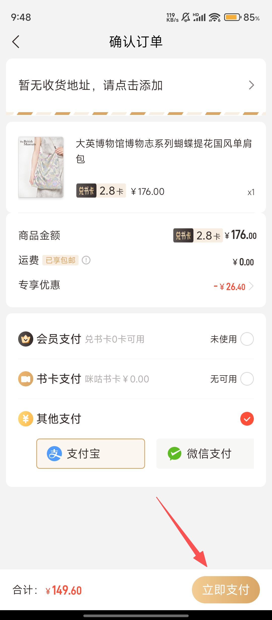4、在确认订单页,添加收货地址后,选择支付方式,最后点击【立即支付】,就能完成文创商品的购买啦。