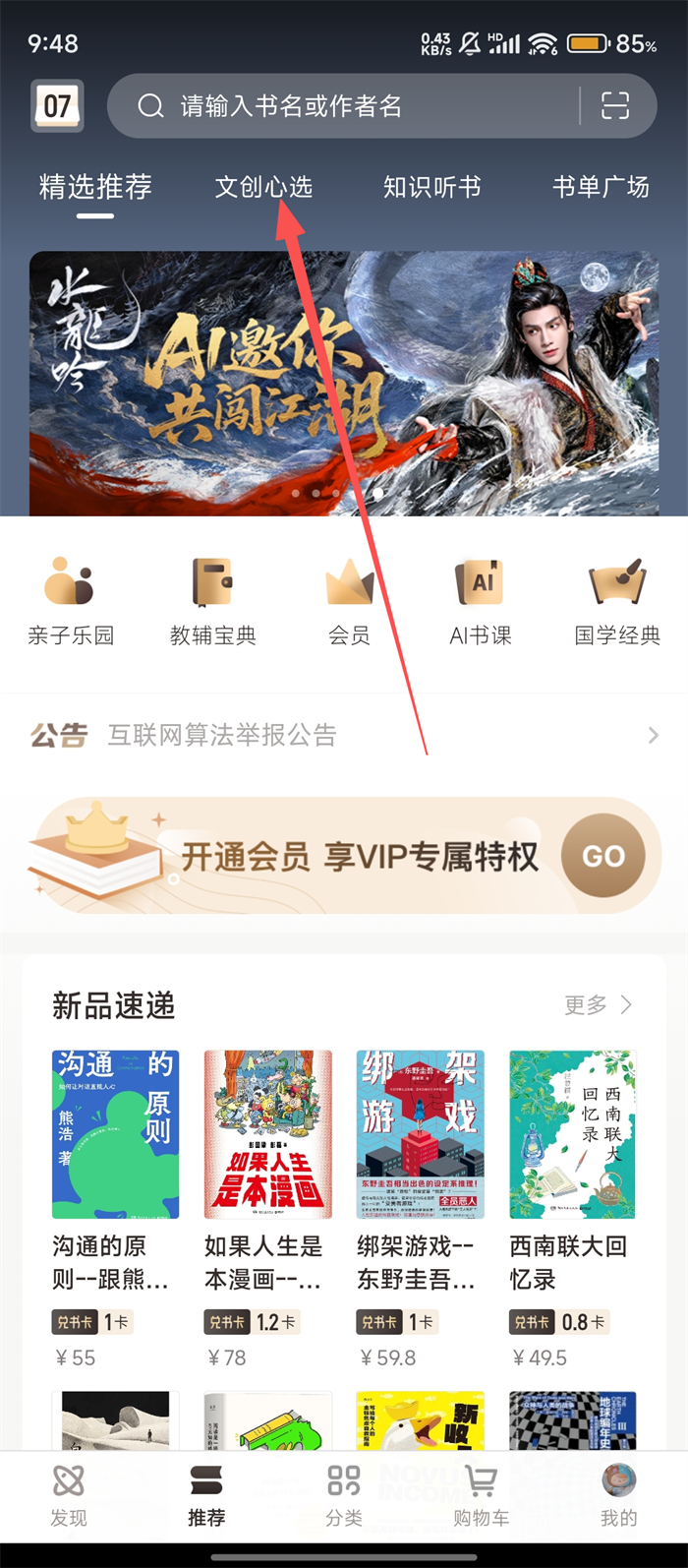 1、打开咪咕云书店,在顶部导航栏点击【文创心选】,即可进入文创商品专区,开启文创好物挑选之旅啦。
