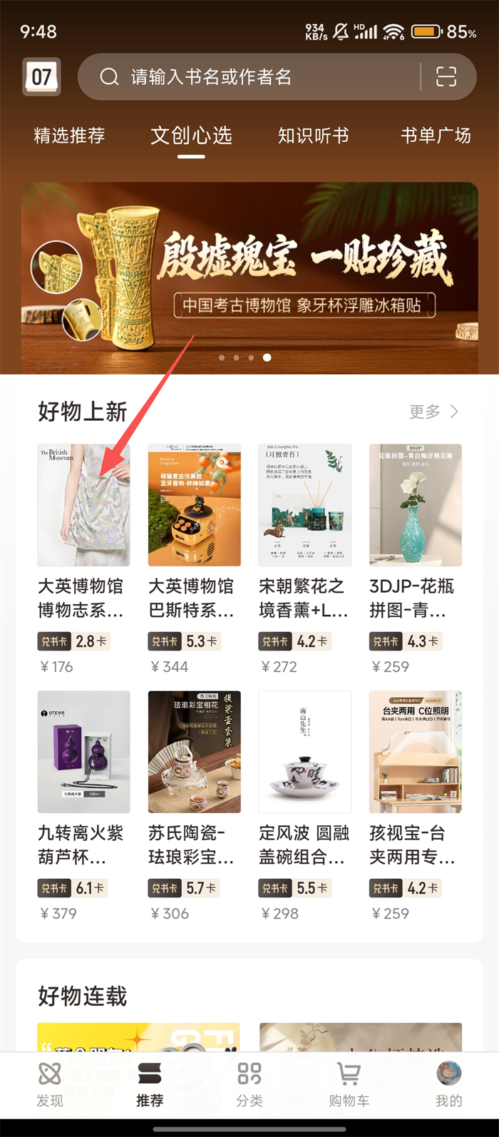 2、在【文创心选】专区里,浏览【好物上新】板块,看到喜欢的商品就点击进入详情页哦。