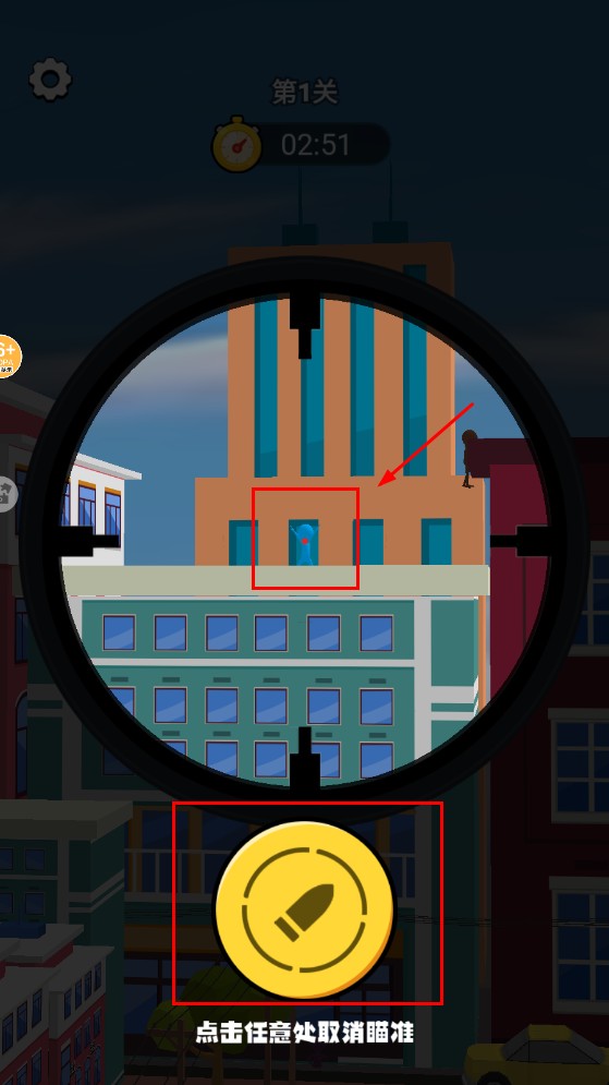 2、在瞄准界面锁定建筑窗户里的外星人,点击【子弹】图标射击,注意剩余时间。