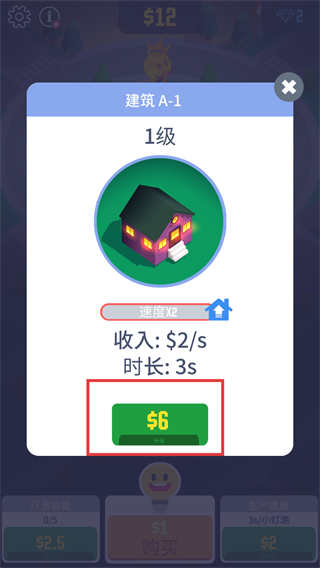 2、当界面显示【建筑A-1-1级】时,点击绿色【$6-升级】按钮提升等级,可增加每秒收入。
