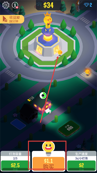 4、底部按钮显示【$1.1-购买】时点击它,持续获取道具让小人运至核心建筑,加速资源积累。