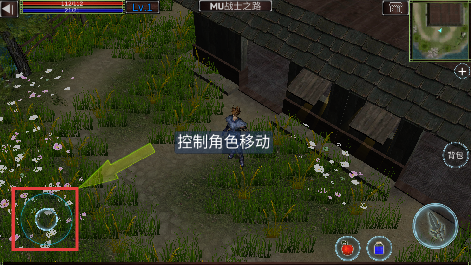 2、利用左下角虚拟摇杆,操控【Lv.1】角色在草地、房屋区域移动,完成移动引导。