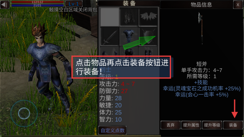 3、在装备界面,点击物品后点击【装备】按钮,为角色穿戴装备,提升战力。