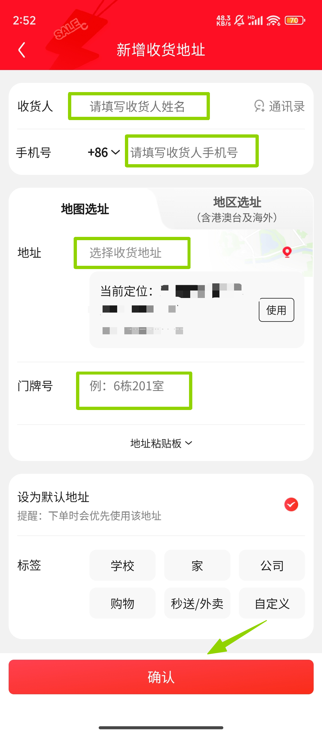 4、在新增收货地址页面,填写收货人、手机号、地址等信息,点击【确认】,即可完成地址添加。