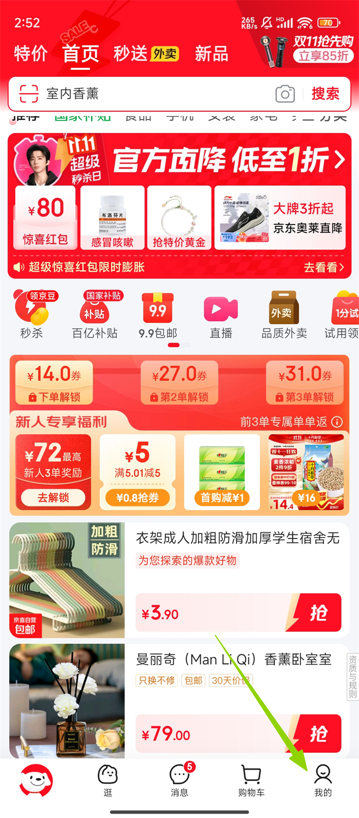 1、打开京东主界面,点击底部【我的】,进入个人页面。