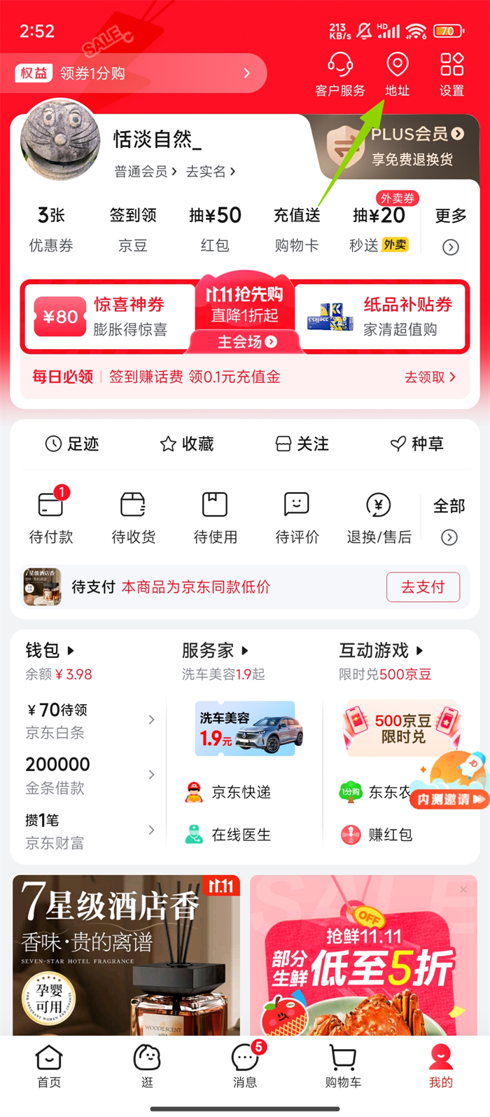 2、在个人页面,点击右上角【地址】,进入收货地址界面。