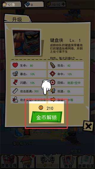 1、当拥有【210】金币时,点击【金币解锁】按钮,可解锁【键盘侠】角色,增强战斗阵容。