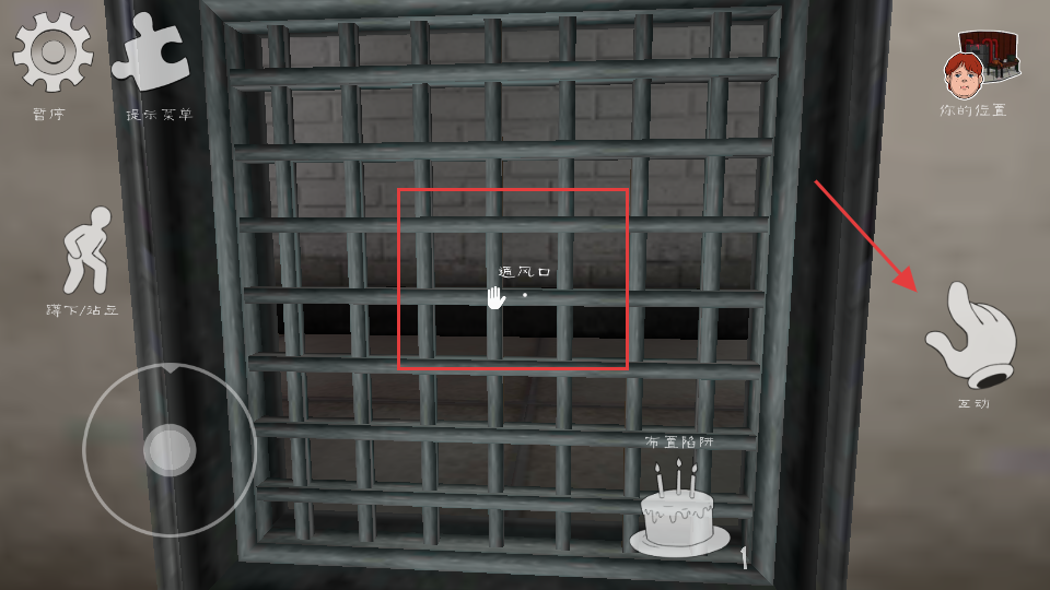 2、在铁栅栏的通风口处,当出现互动提示时,可触发操作,或许能进入通风管道探索,获取逃离线索或道具。