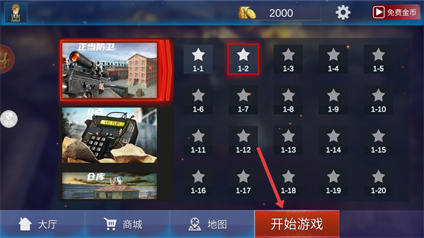 1、选择【1-2】关卡,点击【开始游戏】按钮,进入“正当防卫”主题的射击关卡。