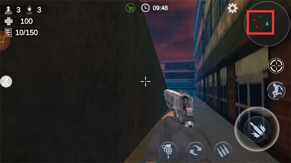 2、通过右上角红框内的小地图观察敌人位置,操控角色移动,准备发起射击。