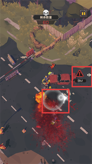 3、当界面出现警示标识时,拉开与高危目标的距离,继续作战以推进【剩余数量-60】的清理。