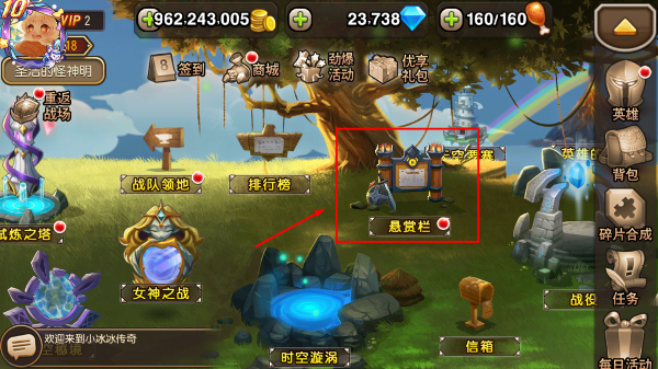 1、主界面找到【悬赏栏】入口点击进入,可查看各类探险任务及奖励领取入口,是获取资源的重要途径。