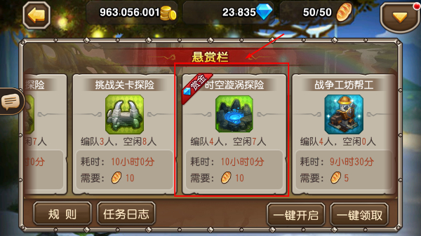 3、在【悬赏栏】选择【时空漩涡探险】,确认编队4人及消耗10道具后开启,耗时10小时。