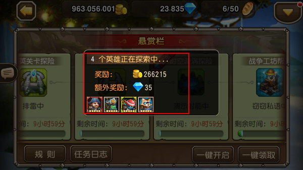 2、进入【悬赏栏】后,对已完成的探险任务点击【领奖励】按钮,可快速获取金币、钻石等资源。