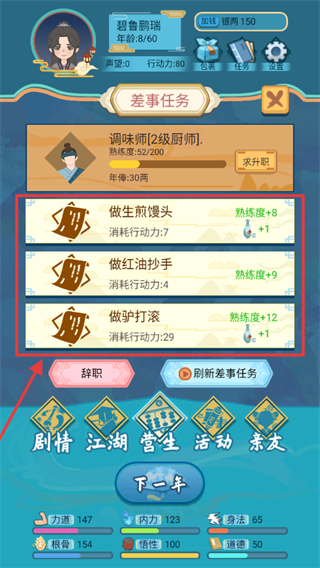 1、在差事任务里,可接【做生煎馒头】、【红油抄手】(加9熟练度,4行动力)或【驴打滚】(加12熟练度,29行动力),按需提升厨艺。