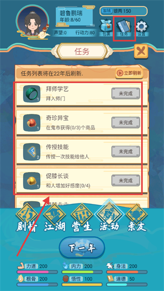 4、自由选择每年要做的事,比如争夺武林盟主或体验医女等不同人生来完成任务。