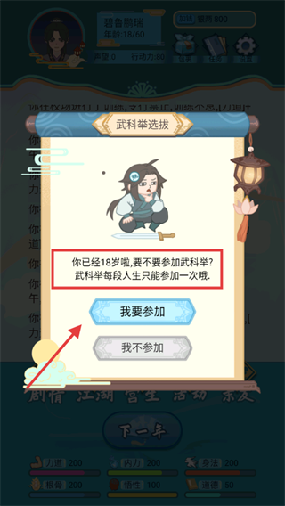 3、18岁时武科举选拔开启,每人仅一次机会,选择【我要参加】,开启武科举挑战。
