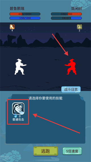 4、战斗中与【敛闲树】对决,可选【普通攻击】输出,也可逃跑或开5倍速度调整节奏。