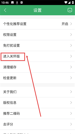 3、在设置页面找到【进入关怀版】选项,点击即可切换至界面更简洁的关怀版模式。