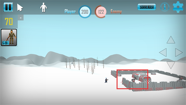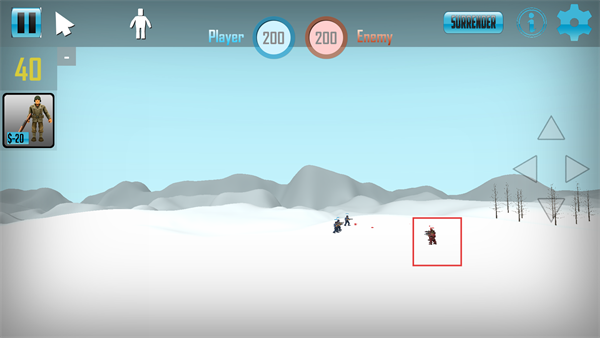 2、开局查看双方阵营的数值,花费【$20】招募士兵,优先击溃红框标识的敌方单位。