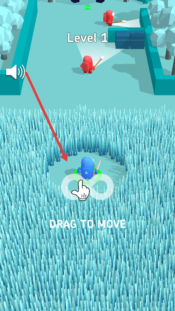 1、拖动屏幕控制蓝色角色在草丛场景中移动,开启关卡挑战。