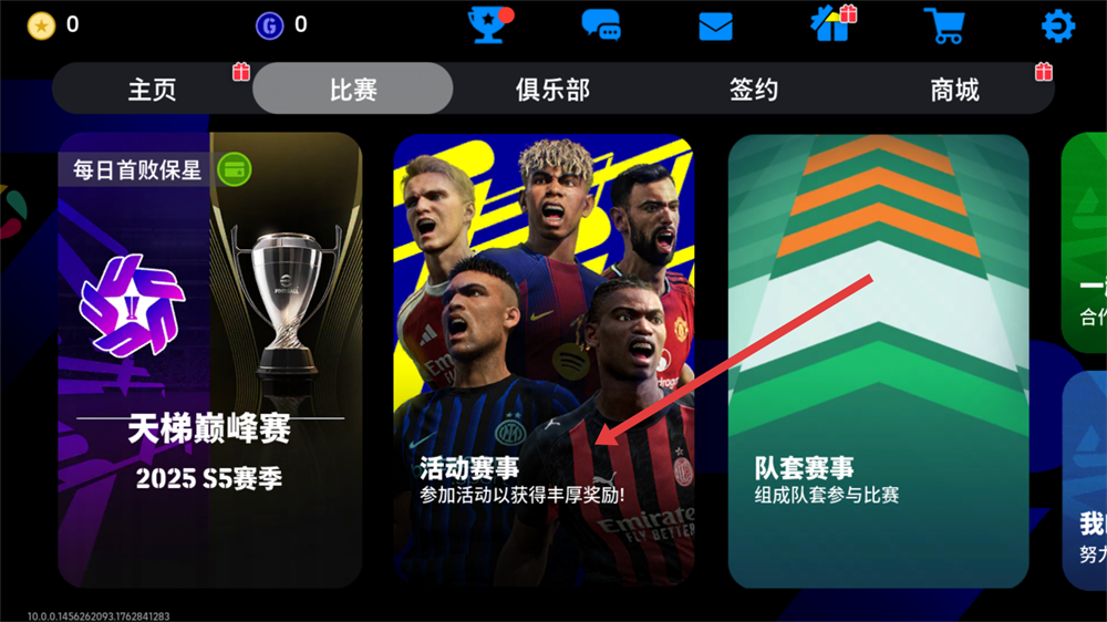 1、在比赛界面,点击【活动赛事】入口,参与各类活动赛事,可获取丰厚奖励,提升球队实力。