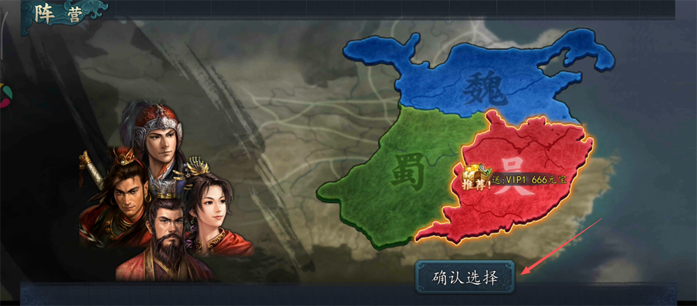 2、阵营选择界面,推荐选择【吴】阵营,可获VIP1和666元宝,点击【确认选择】加入,开启国战之旅哦。