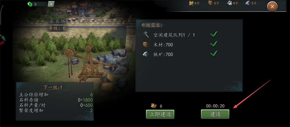 4、建造采石场时,满足空闲建筑队列、木材、铁矿需求后,点击【建造】,提升石料产量啦。