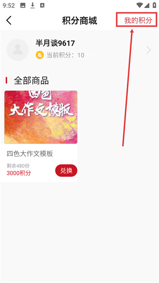 3、进入【积分商城】页面后,点击右上角【我的积分】按钮,即可查看个人积分的详细信息。