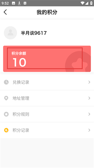 4、在【我的积分】页面,可查看【积分余额-10】,还能查看【兑换记录】【积分规则】等相关内容。